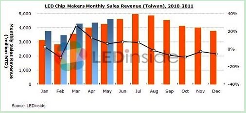 近日消息,據(jù)統(tǒng)計(jì),2011年5月臺(tái)灣上市上柜 LED 廠商營(yíng)收總額約新臺(tái)幣99.57億元(月成長(zhǎng)5.8%、年成長(zhǎng)8.3%)。