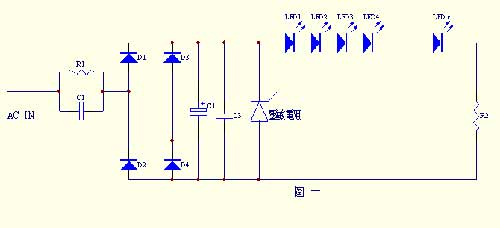 圖一為一個實(shí)際的采用電容降壓的LED驅(qū)動電路。請注意,大部分應(yīng)用電路中沒有連接壓敏電阻或瞬變電壓抑制晶體管,建議連接上,因壓敏電阻或瞬變電壓抑制晶體管能在電壓突變瞬間(如雷電、大用電設(shè)備起動等)有效地將突變電流泄放,從而保護(hù)二級關(guān)和其它晶體管,它們的響應(yīng)時間一般在微毫秒級。
