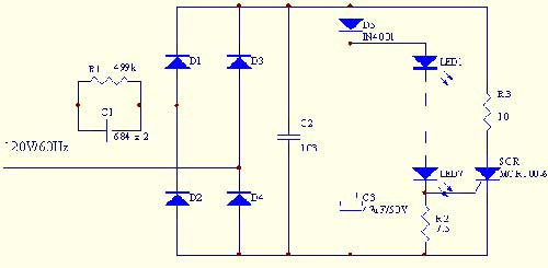 在圖二電路中﹐可控硅SCR及R3組成保護(hù)電路﹐當(dāng)流過LED的電流大于設(shè)定值時﹐SCR導(dǎo)通一定的角度﹐從而對電路電流進(jìn)行分流﹐使LED工作于恒流狀態(tài)﹐從而避免LED因瞬間高壓而損壞。