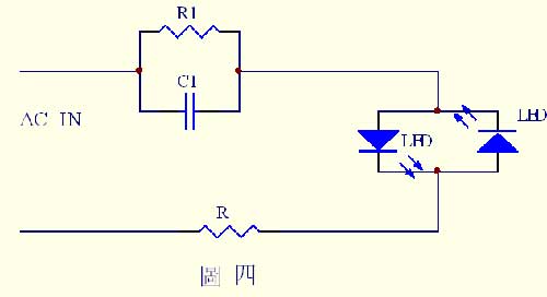 圖四是一個最簡單的電容降壓應(yīng)用電路﹐電路中利用兩只反并聯(lián)的LED對降壓后的交流電壓進(jìn)行整流﹐可以廣泛應(yīng)用于夜光燈﹑按鈕指示燈﹐要求不高的位置指示燈等場合。