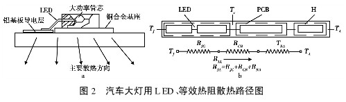 本文研究的汽車前大燈用LED是目前OSRAM公司最大功率的一種LEUMD1W4;管芯散熱設(shè)計(jì)選用了一種更利于散熱的LE3S封裝。這種封裝的特點(diǎn)是,以面積較大的銅合金散熱墊為基座,管芯固定在基座中央。同時(shí)將LED基座與鋁基板接觸區(qū)域的絕緣介質(zhì)剝離,使銅合金基座與鋁基板直接接觸?;系臒嶂苯觽鲗?dǎo)至LED的外部。這種內(nèi)部結(jié)構(gòu)去處了管芯和基座之間的介質(zhì)減少了熱阻,更直接地將管芯的結(jié)溫導(dǎo)出(見圖2a)。