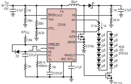 大多數(shù)前燈應(yīng)用需要約 50W LED 電流。凌力爾特公司的 LT3755 設(shè)計(jì)成服務(wù)于這種類型的應(yīng)用。它可以將汽車總線電壓(標(biāo)稱值為 12V)提高到 60V,以驅(qū)動(dòng)多達(dá) 14 個(gè)串聯(lián)連接的 1A LED,如圖1所示。