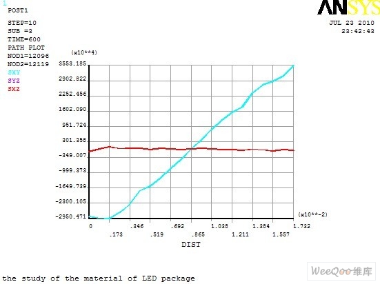 圖10 顯示了路徑上剪應(yīng)力的變化情況,SYZ 與SXZ 幾乎重合,且剪應(yīng)力很小,變化平緩;SXY 變化非常劇烈,說明在Y 方向上,即基板與熱沉之間有較大的剪應(yīng)力,且由中間向兩端增大,表明剪應(yīng)力主要集中在邊角區(qū)域。這是由于基板與熱沉為兩種不同的材料,材料之間的熱膨脹系數(shù)及彈性模量不同而產(chǎn)生較大剪應(yīng)力。
