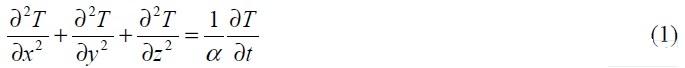 其中:T 為溫度;t 為時(shí)間;x, y, z 空間三維坐標(biāo)系;α 為熱膨脹系數(shù),α 滿足方程: