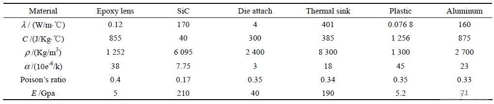 表1 LED 封裝材料的熱力學(xué)參數(shù)