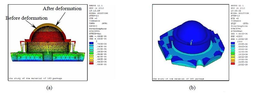 圖4 Lumileds 1 W LED 的熱變形云圖(a)和等效應(yīng)力云圖(b)