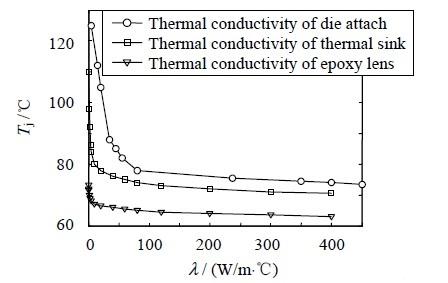 由圖可知,LED 結(jié)溫隨著熱沉和鍵合層導(dǎo)熱系數(shù)的變化趨勢(shì)類似,當(dāng)λ 較小時(shí),隨著λ 增大,結(jié)溫迅速降低;當(dāng)λ 較大時(shí),隨著各種材料導(dǎo)熱系數(shù)變化,結(jié)溫變化平緩。這是因?yàn)楫?dāng)λ 較小時(shí),各材料的熱阻較大,而當(dāng)λ 較大時(shí),熱阻減小,熱量能順利傳出,此時(shí)導(dǎo)熱系數(shù)不再是影響整個(gè)系統(tǒng)傳熱效果的主要因素。由于LED 傳熱并不經(jīng)過透鏡,所以透鏡的導(dǎo)熱系數(shù)對(duì)LED 的結(jié)溫變化影響很小。