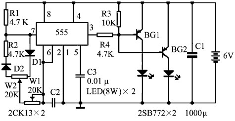 用555 時(shí)基電路可組成各種形式的自激式多諧振蕩器。大功率LED 頻閃光源,主要由1 個(gè)555 多諧振蕩器構(gòu)成的信號(hào)發(fā)生器、1 個(gè)功率放大器和2 個(gè)LED 組成。信號(hào)發(fā)生器的作用是產(chǎn)生所需要的工作頻率脈沖,并且振蕩頻率可以根據(jù)需要調(diào)整。功率放大器將脈沖信號(hào)放大后,驅(qū)動(dòng)大功率LED 發(fā)光。改變信號(hào)發(fā)生器的振蕩頻率,可使光源的頻閃時(shí)間間隔隨之變化;過(guò)增、減LED 個(gè)數(shù)或更換不同功率的LED ,可以改變光源的總亮度。如圖3 所示,電路中的555 多諧振蕩器電路,既可以調(diào)節(jié)振蕩頻率,又可以調(diào)整振蕩脈沖的占空比。信號(hào)發(fā)生器的振蕩頻率就是LED 閃光的頻率,可以根據(jù)拍攝對(duì)象調(diào)整。而振蕩脈沖的占空比,決定了LED 每次頻閃的延續(xù)時(shí)間。