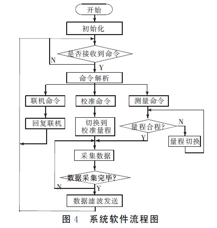 系統(tǒng)軟件采用C語(yǔ)言編寫,在IAR公司提供的集成調(diào)試環(huán)境Workbech下采用模塊化思想進(jìn)行設(shè)計(jì)。系統(tǒng)的軟件程序固化在MSP430F149單片機(jī)的內(nèi)部Flash存儲(chǔ)器中。系統(tǒng)的程序流程如圖4所示。整個(gè)流程可分為初始化、命令解析、數(shù)據(jù)測(cè)量、數(shù)據(jù)處理及顯示程序。程序設(shè)計(jì)借鑒實(shí)時(shí)操作系統(tǒng)的思想,劃分事件和目標(biāo)。系統(tǒng)按照工作過程共有命令解析、聯(lián)機(jī)、校準(zhǔn)、測(cè)量判斷、數(shù)據(jù)采集、數(shù)據(jù)打包發(fā)送等幾個(gè)事件,通過對(duì)事件的處理來完成相應(yīng)的功能,并進(jìn)行必要的狀態(tài)轉(zhuǎn)換。當(dāng)電壓改變后,接收到測(cè)量命令,進(jìn)入測(cè)量狀態(tài),將數(shù)據(jù)發(fā)送并顯示,回到空閑狀態(tài)繼續(xù)等待命令然后進(jìn)行相應(yīng)的操作。