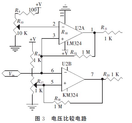 放大后的電壓Vin分別輸入單片機(jī)A/D通道和由LM324組成的上下限電壓比較器,根據(jù)比較器輸出分析信號(hào)幅度是否在規(guī)定范圍內(nèi)。為了使電路工作更穩(wěn)定,比較電壓值需預(yù)留一定的豁量。如圖3所示,調(diào)節(jié)R10使比較上限電壓為2.3V,調(diào)節(jié)R17使比較下限電壓為0.1V,當(dāng)Vin在0.1~2.3V時(shí),量程合適,比較器輸出邏輯電平00,啟動(dòng)A/D轉(zhuǎn)換電路。否則,當(dāng)Vin>2.3V時(shí),通過模擬開關(guān)MAX312并配合軟件來切換I/V轉(zhuǎn)換電路的反饋電阻,向大量程切換;當(dāng)Vin<0.1V時(shí),向小量程切換,以適應(yīng)不同強(qiáng)度的光信號(hào)。