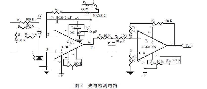 亮度測(cè)量電路由I/V轉(zhuǎn)換電路和二級(jí)放大電路組成。OLED器件發(fā)出的光入射到光敏二極管GT101,輸出僅0.002~200μA 的電流信號(hào),I/V轉(zhuǎn)換電路器件選用具有極低輸入偏置電流的單片電路靜電計(jì)型運(yùn)算放大器OP07.OP07具有低輸入電流和低輸入補(bǔ)償電壓,因此適合作為非常敏感的光敏二極管的前置放大器。如圖2所示,通過調(diào)節(jié)R12可將運(yùn)放的失調(diào)調(diào)零,R2補(bǔ)償集成運(yùn)放的偏置電流。