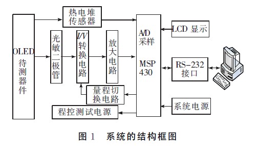 針對(duì)以上問題,本文設(shè)計(jì)了一套基于微控制器的OLED光電性能綜合測(cè)試系統(tǒng),系統(tǒng)以微控制器為核心,是一個(gè)將精密恒壓(恒流)電源、電壓電流測(cè)量、溫度測(cè)量、亮度測(cè)量有機(jī)地結(jié)合在一起的測(cè)量系統(tǒng),可實(shí)現(xiàn)測(cè)試條件設(shè)置、數(shù)據(jù)存儲(chǔ)、分析、圖形化顯示、打印輸出等功能,實(shí)現(xiàn)了對(duì)OLED器件光電性能的高精度快速自動(dòng)測(cè)量,使OLED器件的光電性能測(cè)試工作變得方便、快捷、科學(xué)。