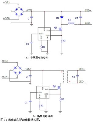 作為一種新型的節(jié)能、環(huán)保的綠色光源產(chǎn)品,LED擁有廣闊的市場前景。市場現(xiàn)階段已經(jīng)出現(xiàn)上千款LED驅(qū)動IC。其中我們遇到比較多的是單芯片線路結(jié)構(gòu)(圖1a)。