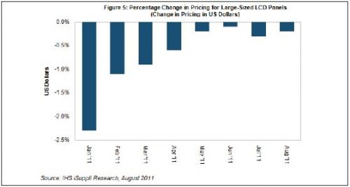 據(jù)IHS iSuppli公司的液晶顯示器(LCD)價(jià)格研究報(bào)告,8月份大尺寸LCD面板價(jià)格下降速度預(yù)計(jì)略慢于7月,供應(yīng)商積極降低產(chǎn)能利用率預(yù)計(jì)會(huì)防止面板價(jià)格進(jìn)一步下滑。