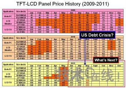 日本高級(jí)數(shù)據(jù)研究機(jī)構(gòu)首席執(zhí)行官高多清作就持這種觀點(diǎn)。2008年美國金融危機(jī)時(shí),他對(duì)TFT-LCD面板價(jià)格做出了下降走勢(shì)的準(zhǔn)確判斷,因此,他對(duì)預(yù)計(jì)本次美國債務(wù)危機(jī)期間的TFT-LCD面板價(jià)格仍會(huì)繼續(xù)走低非常自信(見圖1)。