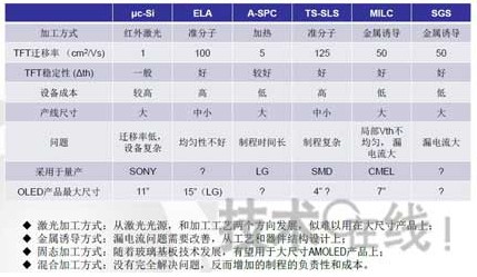 對(duì)于AMOLED顯示器對(duì)TFT背板的要求,京東方的未來技術(shù)研發(fā)總監(jiān)王剛表示,1.TFT載流子遷移率要高,以便在顯示周期內(nèi)為OLED單元提供足夠載流子注入;匹配OLED的電流效率。2.TFT穩(wěn)定性,TFT的開關(guān)特性不隨工作時(shí)間顯著變化,或在可控范圍內(nèi)變化,以保證從數(shù)據(jù)信號(hào)得到的顯示結(jié)果前后一致。3.TFT均勻性,在整個(gè)顯示矩陣上,TFT的開關(guān)特性趨于一致,減少因特性差異而增加的補(bǔ)償電路。還有,為將OLED用于柔性和透明顯示應(yīng)用,要求TFT背板的可撓性及透明化;底發(fā)射時(shí)為提高開口率要求TFT尺寸小。硅基TFT AMOLED技術(shù)比較如圖3所示。