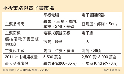 蘋果iPad系列持續(xù)在平板計(jì)算機(jī)市場(chǎng)一枝獨(dú)秀,爆發(fā)性成長(zhǎng)讓各家電信、PC及手機(jī)制造廠趨之若鶩,由于平板計(jì)算機(jī)具備多媒體觸控特性,讓電子書閱讀器業(yè)者憂心忡忡,擔(dān)心平板計(jì)算機(jī)大軍崛起恐沖擊電子書市場(chǎng),然蘋果憑借軟件、成本、價(jià)格與規(guī)模優(yōu)勢(shì),陸續(xù)讓部分平板計(jì)算機(jī)業(yè)者知難而退,反觀電子書市場(chǎng)穩(wěn)定成長(zhǎng),供應(yīng)鏈廠商業(yè)績(jī)持續(xù)翻揚(yáng),平板計(jì)算機(jī)大軍暫難發(fā)揮影響力,讓電子書廠商暫時(shí)松了一口氣。就目前平板計(jì)算機(jī)品牌版圖來(lái)看,仍以蘋果iPad系列獨(dú)占鰲頭,業(yè)界預(yù)估2011年市占率約60~65%,其次是三星電子(Samsung Electronics),市占率約5~6%,其它各品牌廠市占分別落在1~3%,尤其是2011年初時(shí)被業(yè)界視為蘋果iPad殺手,未推出產(chǎn)品就先轟動(dòng)的惠普(HP)、RIM及摩托羅拉(Motorola)等品牌廠,推出前預(yù)估出貨量很高,然這些憑借品牌及軟件平臺(tái)光芒的先頭部隊(duì)卻最先敗陣,讓現(xiàn)存平板計(jì)算機(jī)業(yè)者更加憂心。