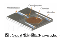 除了熱界面外,主動(dòng)散熱系統(tǒng)已越來越受企業(yè)的歡迎。圖3給出了SynJet主動(dòng)散熱模塊,它可以產(chǎn)生脈動(dòng)空氣,從而可以把LED燈內(nèi)部的熱直接帶到外面。據(jù)了解,SynJet技術(shù)可以幫助設(shè)計(jì)師解決一些產(chǎn)品的散熱問題,如電腦產(chǎn)品,特別是高可靠性的LED產(chǎn)品。該技術(shù)有高散熱效率、低噪音、高可靠性和低功耗等優(yōu)點(diǎn)。