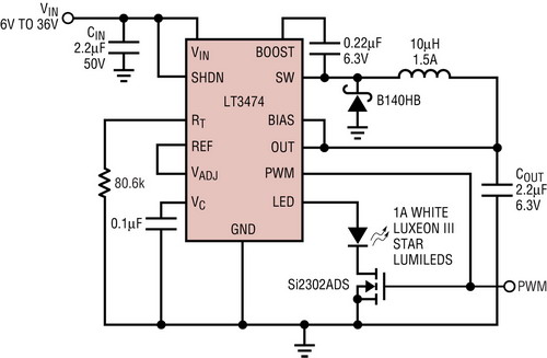 LED亮度可由圖1中的LT3474來(lái)控制,把一個(gè)模擬電壓輸入連接至VADJ引腳或把一個(gè)數(shù)字PWM信號(hào)輸送至PWM調(diào)光MOSFET的柵極和PWM引腳。簡(jiǎn)單的模擬亮度控制通過(guò)降低內(nèi)部檢測(cè)電阻上的電壓,將恒定LED電流從1A降至更低的值,但是LED光線(xiàn)的顏色在低電流時(shí)會(huì)變化。調(diào)光比的實(shí)際限制大約為10:1。