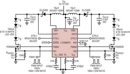 就夜間觀(guān)看極亮的顯示器而言,LT3486以其獨(dú)特的內(nèi)部PWM調(diào)光架構(gòu)提供1000:1的PWM調(diào)光比。內(nèi)部LED電流存儲(chǔ)器具有超快PWM響應(yīng)時(shí)間,可以低于10us的時(shí)間讓LED電流從零返回到100mA,以實(shí)現(xiàn)真彩PWM調(diào)光。在高端顯示器中用兩個(gè)LT3486驅(qū)動(dòng)分別代表紅、綠、綠、藍(lán)(R-G-G-B)的4個(gè)LED串,可實(shí)現(xiàn)1000:1的調(diào)光比,并在非常暗的夜間工作環(huán)境保持顯示器的真彩特性。