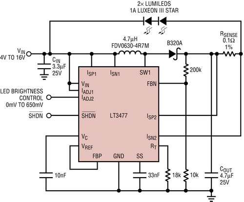 圖3所示的LT3477降壓-升壓型LED驅(qū)動(dòng)器以1A電流驅(qū)動(dòng)兩個(gè)大功率LED。這兩個(gè)LED無(wú)需以地為基準(zhǔn),連接的兩個(gè)端子一般是轉(zhuǎn)換器的輸出和電池輸入。LT3477有兩個(gè)獨(dú)特和具100mV浮動(dòng)電流檢測(cè)輸入引腳,這引腳連接與LED串串聯(lián)而且不以地為基準(zhǔn)的電流檢測(cè)電阻。在汽車(chē)電池的工作電壓范圍內(nèi)以及低于這個(gè)范圍時(shí),在電流直到1A的情況下都可實(shí)現(xiàn)準(zhǔn)確的LED穩(wěn)流。LT3477的停機(jī)引腳用于實(shí)現(xiàn)車(chē)燈的接通/斷開(kāi)功能,并在未使用時(shí)將輸入電流降低到1uA(典型值為100nA)。IADJ引腳用來(lái)為后部信號(hào)指示燈或剎車(chē)燈等剎車(chē)燈和尾燈應(yīng)用實(shí)現(xiàn)高于10:1的模擬調(diào)光比。這類(lèi)應(yīng)用無(wú)需真彩PWM調(diào)光。