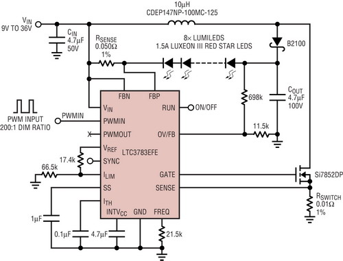 如圖4所示,大功率LED驅(qū)動(dòng)器LTC3783采用降壓-升壓型拓?fù)?,?qū)動(dòng)6至10個(gè)3W紅光LED,用于汽車(chē)尾燈應(yīng)用。外部開(kāi)關(guān)MOSFET和開(kāi)關(guān)電流檢測(cè)電阻為大功率和高壓LED驅(qū)動(dòng)器設(shè)計(jì)提供了最大的設(shè)計(jì)靈活性。如果電池電壓降至低于9V,那么9V至36V輸入和在電流為1.5A時(shí)高達(dá)25V的LED串輸出需要100V的額定開(kāi)關(guān)電壓和高于8A的峰值開(kāi)關(guān)電流能力。在整個(gè)汽車(chē)電池電壓范圍內(nèi),1.5A恒定電池電流是良好穩(wěn)定的。就剎車(chē)燈和尾燈調(diào)光而言,在100Hz時(shí),可以用直接連接到LTC3783PWM引腳的PWM信號(hào)降低LED電流,以實(shí)現(xiàn)高達(dá)200:1的調(diào)光比。在1kHz時(shí),調(diào)光比降低至?20:1,這對(duì)尾燈應(yīng)用來(lái)說(shuō)已足夠了。調(diào)節(jié)ILIM引腳也可以降低LED電流。