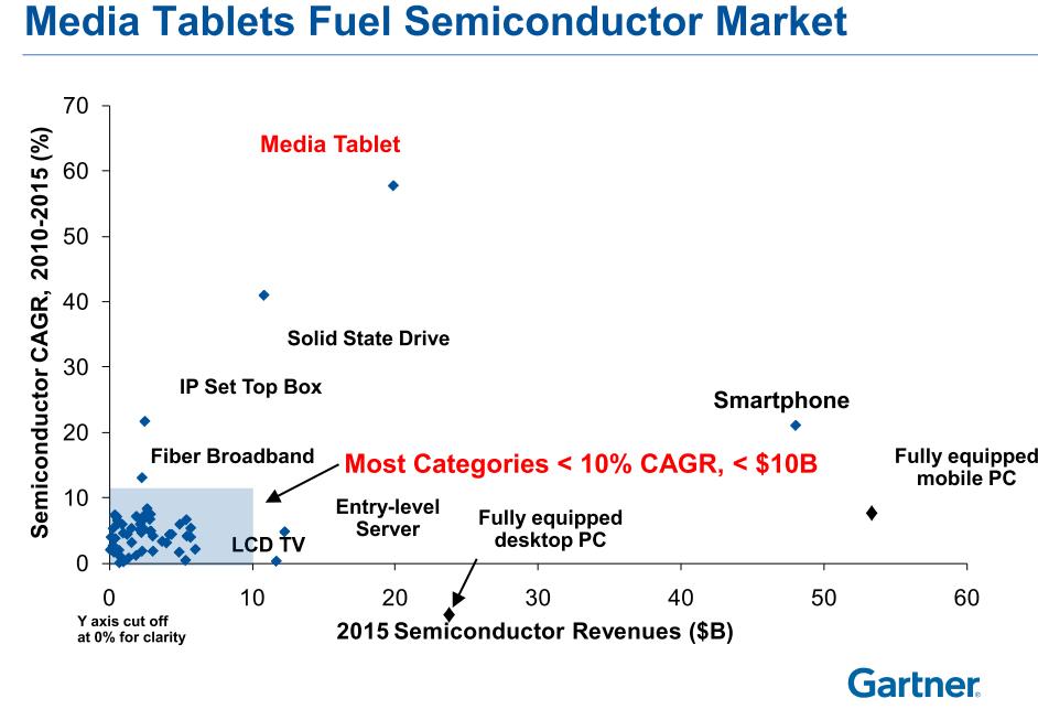 在這107項(xiàng)被調(diào)查的產(chǎn)品中,幾乎絕大多數(shù)在未來5年內(nèi)的半導(dǎo)體產(chǎn)值都在100億美元以內(nèi)(上圖左下角藍(lán)色部份)。而接下來的幾年,扮演推動(dòng)半導(dǎo)體成長重任的產(chǎn)品,將從PC轉(zhuǎn)移到平板計(jì)算機(jī)、智慧手機(jī)和固態(tài)硬盤(SSD)身上。