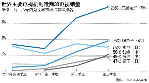 據(jù)市場調(diào)查機(jī)構(gòu)Display Search 20日公布的《第三季度世界3D電視銷量》顯示,中國有4家企業(yè)進(jìn)入前十,分別是創(chuàng)維(50萬臺,第4位)、海信(49萬臺,第5位)、長虹(34萬臺,第7位)、康佳(27萬臺,第9位)。