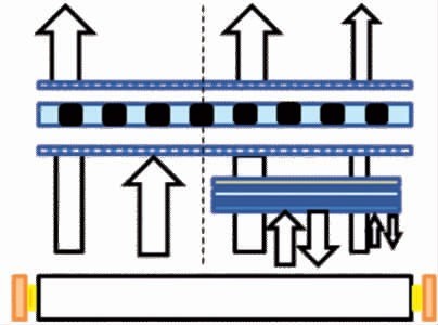 為了使用盡可能少的LED而又保持良好的光學(xué)特性,本文設(shè)計(jì)的LED背光選用了1層擴(kuò)散膜、2層棱鏡膜和1層雙層增亮膜(DBEF),膜材參數(shù)如表1所示。擴(kuò)散膜可以改變LGP出射的光路,讓射出的光更加均勻;還可以隱藏LGP 上的dot,使從正面看不到散射點(diǎn)的影子,擴(kuò)大視野角,提升輝度。棱鏡膜即增亮片,主要利用全反射和折射定律,將分散的光集中于一定角度范圍內(nèi)出射,從而提高該范圍內(nèi)的亮度。DBEF 是本文LED背光模組的關(guān)鍵膜材,可以使整個(gè)模組的亮度提升一倍,其工作原理如圖2所示。DBEF可以將不能通過(guò)下偏光片的光線反射回背光,經(jīng)背光的二次反射,部分光線又可以通過(guò)DBEF和下偏光片出射。經(jīng)過(guò)多次回收和利用,光的透過(guò)率得以大幅提高。