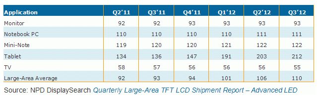 NPD DisplaySearch最新季度大尺寸TFT-LCD面板出貨調查指出兩個趨勢,一是平板電腦用面板持續(xù)往更高分辨率方向發(fā)展,二是低成本直下式LED背光面板將逐漸成為TFT-LCD電視面板另一主流。