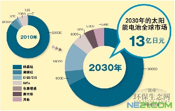 該調(diào)查的特點(diǎn)在于根據(jù)太陽(yáng)能電池的不同種類進(jìn)行預(yù)測(cè)。轉(zhuǎn)換效率及性價(jià)比較高的結(jié)晶硅太陽(yáng)能電池到2030年將擴(kuò)大到9萬(wàn)億日元,約為2010年的3倍。約占整個(gè)市場(chǎng)的7成,依然是主流產(chǎn)品。