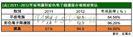 整體而言, WitsView 認為 2012年平板電腦的發(fā)展基調將偏向樂觀,預估平板電腦本身的需求達8,260萬臺,彩色電子閱讀器方面則為1,230萬臺,兩者合計的市場規(guī)模將從今年的5,760萬臺攀升至9,490萬臺,年成長率高達65%。