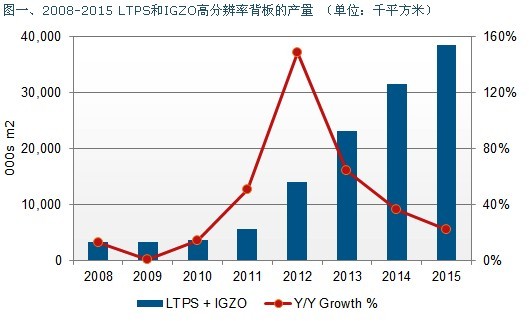 根據(jù)NPD DisplaySearch TFT LCD制程技術(shù)藍(lán)圖趨勢報(bào)告(TFT LCD Process Roadmap Report)指出,2012年高移動速率TFT-LCD背板產(chǎn)量預(yù)計(jì)將提高150%,從2011年的560萬平方米迅速發(fā)展到1千410萬平方米。如此高成長的驅(qū)動力主要在于許多五代線和更大的低溫多晶硅(LTPS)產(chǎn)線于2012年開始投入生產(chǎn),且夏普、樂金顯示和三星現(xiàn)有的產(chǎn)線也投入生產(chǎn)金屬氧化物(IGZO)。
