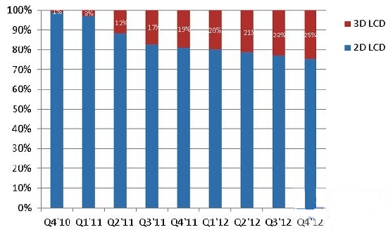 根據(jù)NPD DisplaySearch的調(diào)查,在元旦期間的主要城市賣(mài)場(chǎng),3D液晶電視在零售終端滲透率甚至高達(dá)40%;而整體3D液晶電視出貨滲透率可望在2012年第一季超過(guò)20%;該機(jī)構(gòu)在全球電視出貨與預(yù)測(cè)季報(bào)(Quarterly Advanced Global TV Shipment and Forecast Report)中預(yù)測(cè),到2012年第四季,中國(guó)大陸 3D液晶電視滲透率可達(dá)25%。