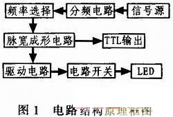對水下成像系統而言,光源的選擇至關重要,光源的穩(wěn)定性、均勻性、響應速度及其光波波長范圍是系統成像的關鍵。采用藍光LED所發(fā)出光光經過水介質——目標反射——水介質——接收光學系統,最終在成像傳感器(CCD,ICCD)上成像。這就決定了LED必須工作在快脈沖驅動方式下,目前市場上的驅動電路一般均丁作在慢脈沖驅動模式(μs量級),遠不能滿足我們的要求。因此,我們必須自己解決快脈沖驅動電路這一難題,尤其是實現以ns量級的大功率快脈沖來驅動大功率的LED?;谶@種實驗實際需求,我們研究開發(fā)了此種快脈沖驅動電路。該電路的基本功能是產生低頻、快速、大功率驅動電流脈沖信號,輸出脈沖的頻率與周期精確度高,穩(wěn)定性好,脈沖信號寬度在20~100 ns內分5檔可調,輸出在50 Hz的基準頻率下工作。脈沖信號通過驅動電路,輸出一個快脈沖信號驅動輸出電流開關,產生一個大電流脈沖信號驅動一個大功率LED。為了達到設計要求和目的,我們采用晶振電路產生高精度頻率/周期基準脈沖作為內置信號源,通過對基準脈沖進行多次分頻,產生所需頻率的輸出脈沖信號,這樣可以獲得頻率穩(wěn)定的脈沖信號,同時實現了頻率選擇。經過分頻后的脈沖信號再經過脈沖寬度成形電路實現脈寬調節(jié),然后經過電流開關電路,產生大電流脈沖,使LED發(fā)光。該驅動電路主要由以下幾個部分組成:信號源、分頻電路、頻率選擇、脈沖寬度電路、TTL輸出、驅動電路和電流開關電路。其框圖如圖1所示。