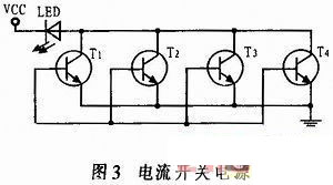 通過成形電路的信號,控制大功率藍光LED發(fā)光,驅動信號控制電流開關。電流開關選用一種大功率高頻三極管,為了滿足LED驅動電流的需求,將4只三極管并聯,使流過LED的脈沖電流最大達到2.5 A,保證了LED在額定功率下工作,達到穩(wěn)定光源的目的。在輸入驅動信號的作用下,三極管進入導通狀態(tài),LED兩端產生一定的壓降,大電流流過LED,使大功率藍光LED發(fā)光,作為距離選通水下成像系統的光源,電路如圖3所示。