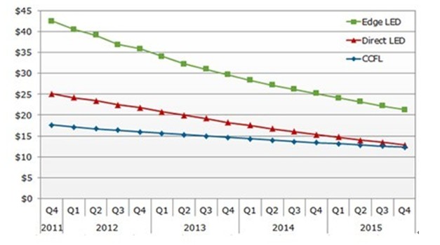 - 直下式LED背光源的成本為CCFL背光源的1.3-1.4倍