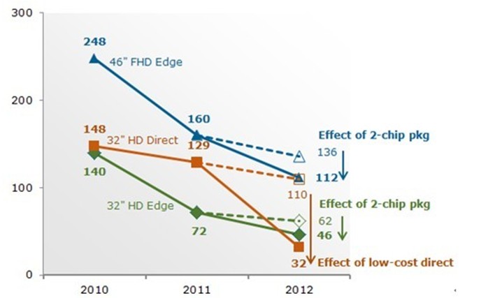 2010-2012電視中使用LED封裝顆數(shù)的變化