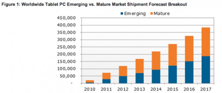 雖然那些數(shù)據(jù)本身就已十分驚人,但更令人關(guān)注的是,大多數(shù)新增的銷量將主要來自新興市場。預計到2017年,新興市場上平板電腦的銷量所占份額將由2011年的36%上升到到46%。