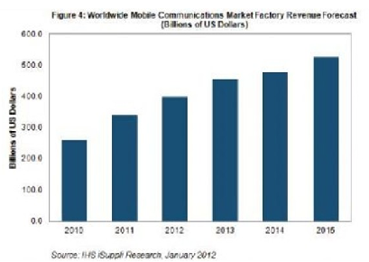 2012年移動(dòng)通信市場的工廠營業(yè)收入預(yù)計(jì)達(dá)到3980億美元,比去年的3408億美元增長17%。盡管今年的增長速度比2011年的32%有所放緩,但總體市場并未顯示出即將下滑的跡象。預(yù)計(jì)明年將保持兩位數(shù)的增長速度,工廠營業(yè)收入到2015年將突破5000億美元,如圖所示。工廠營業(yè)收入是指制造商通過向渠道銷售設(shè)備而獲得的收入,在本案中,廠商銷售的是移動(dòng)通信設(shè)備,如智能手機(jī)以及其它類型的手機(jī),或者路由器等無線基礎(chǔ)設(shè)備。