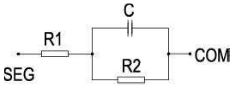 液晶顯示屏是由具有透明電極的ITO玻璃和液晶、偏振片等材料組成的。從電路的角度來講,LCD上ITO走線電阻的大小對顯示對比度有很大的影響。LCD的一個近似等效電路如圖4所示。其中R1表示從LCD電極到LCD像素點的ITO電阻;R2表示LCD像素點的等效直流電阻;C表示該像素點的等效電容。