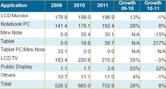筆記本電腦與公共顯示器依舊維持較佳表現(xiàn),分別有8%與52%的出貨成長(zhǎng)。平板電腦尤其是蘋果iPad的強(qiáng)勁出貨態(tài)勢(shì),使平板電腦面板在2011年出貨接近6千萬片,較2010年大幅成長(zhǎng)21%。