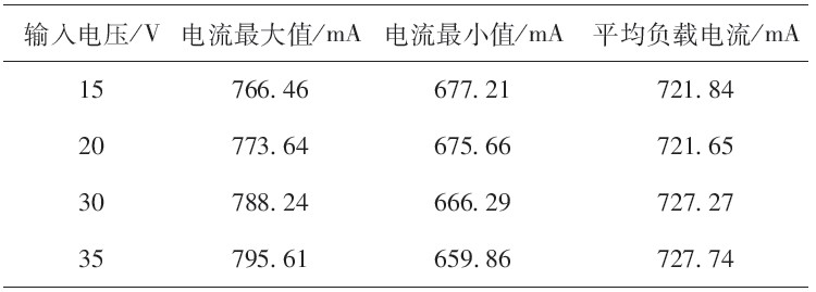 表2為不同輸入電壓下負載電流的峰-峰值。由表中數(shù)據(jù)計算,在輸入電壓由15V變化至35V的過程中,負載電流的最大誤差僅為0.81%.