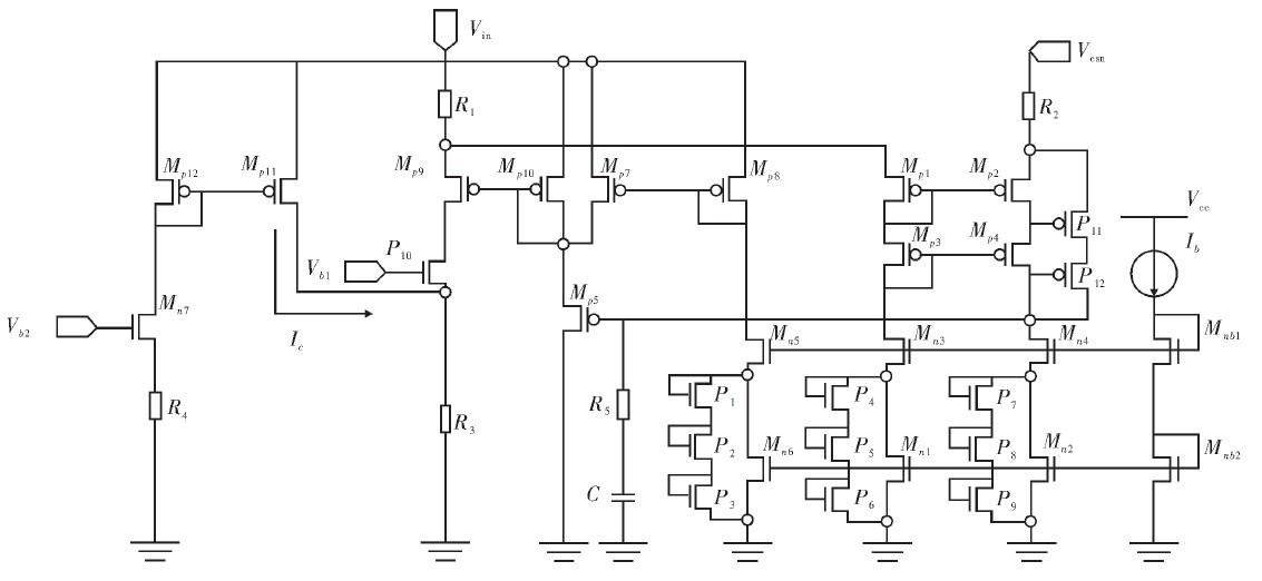 為使低壓管能在高壓輸入中也正常工作,電壓鏡采用了高低壓器件混用的共源共柵結(jié)構(gòu)。Mp1、Mp2、Mn1和Mn2為低壓管;Mp3、Mp4、Mn3和Mn4為高壓管。一方面,高壓管作為共源共柵器件增大了輸出電阻;另一方面,它承受了大部分壓降,以保護低壓管不被擊穿。不過,共源共柵結(jié)構(gòu)帶來另一個問題。串聯(lián)電阻R2令Mp2和Mp4之間的次極點更靠近原點,使系統(tǒng)變得不穩(wěn)定。為消除該極點帶來的影響,在共源共柵結(jié)構(gòu)的輸出端加入補償電阻R5和電容C,引入一個零點并使主極點更低。