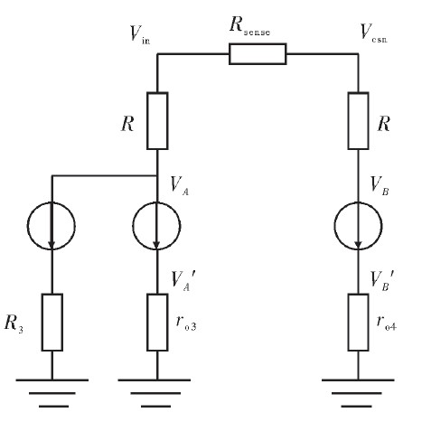 的微小值。由式(6)可以看出,當(dāng)gm1ro2或gm2越大,VA與VB的匹配度越高,電流采樣越精確。值得注意的是,式中出現(xiàn)gm1ro3的平方項,這意味著可以用較小的增益達到高精度。但是,耐壓5 V的低壓管無法在高輸入電壓下正常工作,電路中必須使用大量耐壓40 V的高壓管。然而高壓管的增益與等效輸出電阻很低,無法滿足電流采樣電路的精度要求。