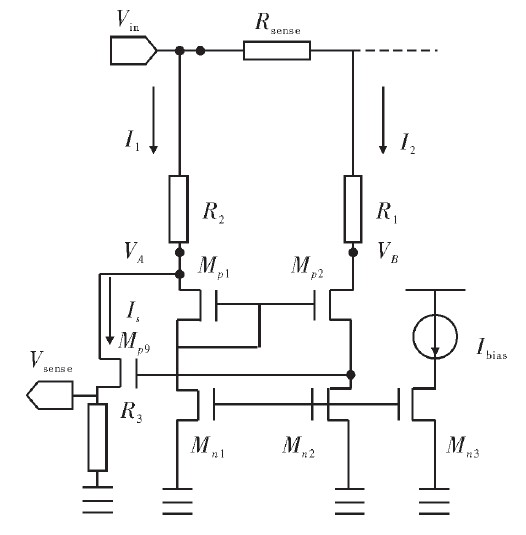 圖2是電路采樣電路結(jié)構(gòu)圖。Rsense為采樣電阻,R1=R2=R;Mp1、Mp2、Mn1、Mn2組成的電壓鏡和Mp9反饋管組成匹配電流源作為電流檢測電路。其中Mp1與Mp2相互匹配并被偏置在飽和區(qū),Mn1與Mn2是兩個相同且非常小的電流源,以保證流過Mp1與Mp2的電流相等從而使其具有相等的VSG。