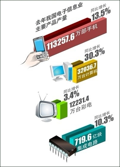 近日,工信部發(fā)布《2011年電子信息產業(yè)統(tǒng)計公報》,在2011年,我國彩電、手機、計算機等主要電子產品產量占全球出貨量的比重分別達到48.8%、70.6%和90.6%,均名列世界第一。