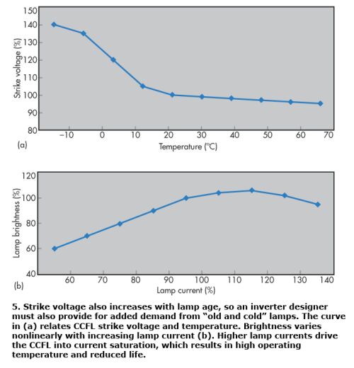 LCD工作時的環(huán)境溫度是背光驅(qū)動器設(shè)計(jì)人員需要考慮的一個關(guān)鍵因素。CCFL啟動或起始電壓與溫度成反比。圖5a顯示了CCFL起始電壓與溫度之間的典型關(guān)系,圖5b則展示了與電燈電流增大相關(guān)的CCFL亮度變化曲線。