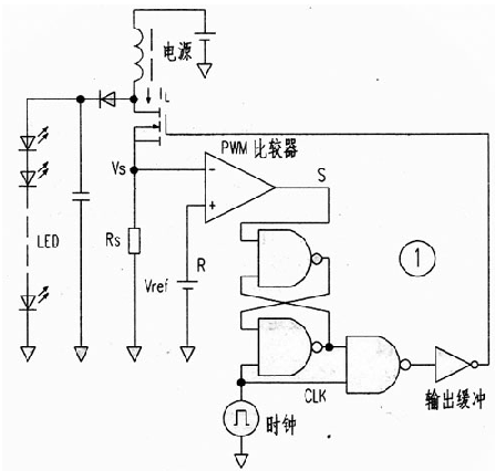 圖1是這種驅(qū)動(dòng)電路的方框圖,它省略了傳統(tǒng)電路的三角波發(fā)生器和誤差放大器,而使用了CM0S邏輯IC和PWM調(diào)制器。當(dāng)時(shí)鐘CLK信號(hào)為低電平時(shí),RS觸發(fā)器處于復(fù)位狀態(tài),輸出FET關(guān)斷。而當(dāng)CLK信號(hào)為高電平時(shí),輸出FET導(dǎo)通。其電流被電阻Rs轉(zhuǎn)換成電壓,當(dāng)此電壓高于基準(zhǔn)電壓Vref時(shí),比較器輸出由高變低,RS觸發(fā)器又被復(fù)位,輸出FET再關(guān)斷。其結(jié)果,即使電源電壓有變化,儲(chǔ)存在電感中的能量卻是恒定的。實(shí)現(xiàn)了恒功率輸出。這里是把Rs上的電壓降作為三角波電壓,PWM比較器將此電壓與基準(zhǔn)電壓直接比較而起到了誤差放大器的作用?! ?br />