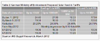 根據(jù)新方案,10MW以上的大型系統(tǒng)從3月9日開始將得不到任何FIT。另外,從2012年5月1日開始,每千瓦時(shí)電費(fèi)將每月下降0.0015歐元,代替每年通常在1月降低FIT的做法。